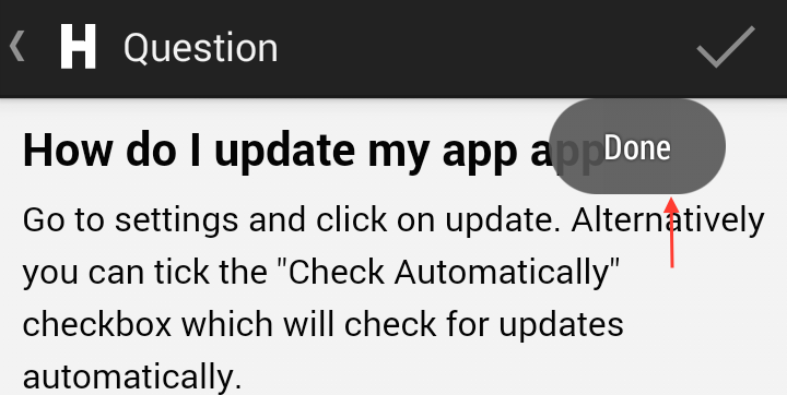 hs__done_btnHelper text for the icon on single faq screen to exit the session without submitting the ticket. This button shows up when showSearchOnNewConversation is set to true and user click on a search result faq. Done