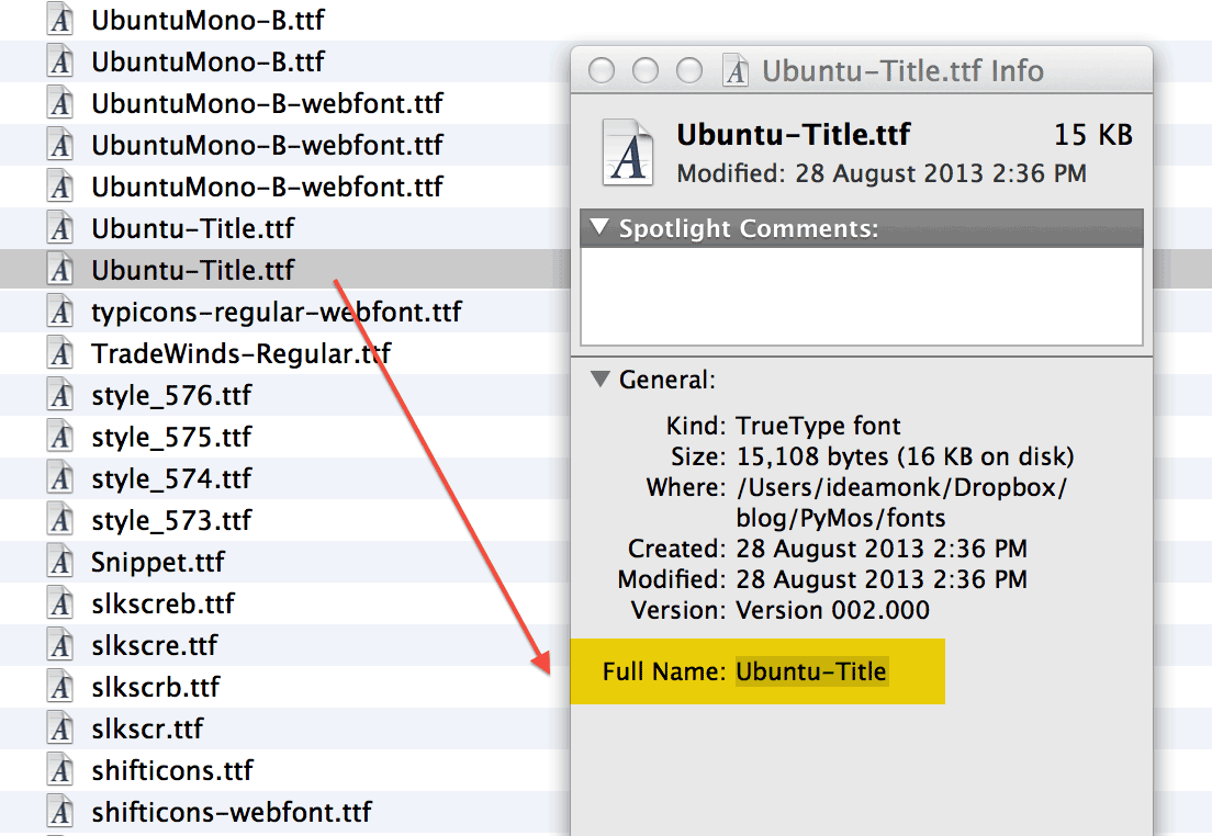 Step 2: Copy the font's full name. To do this, select the font in Finder and hit Command+I (Get Info).