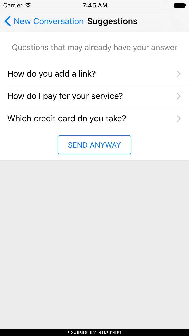 Set showSearchOnNewConversation to YES to show relevant FAQs to a user's issue before it is filed. This helps answer tickets with FAQs before they reach your support team. If there are no relevant FAQs, the user can continue filing a new conversation with his original text by pressing the "Send Anyway" button.