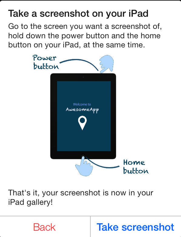 | Hold down your device's power and home buttons at the same time. | Tutorial text for capturing screenshot on iPad |