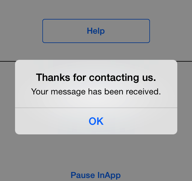 | Thanks for contacting us. | Text for alertview when customer is dropped back to app after starting a conversation ![]() |