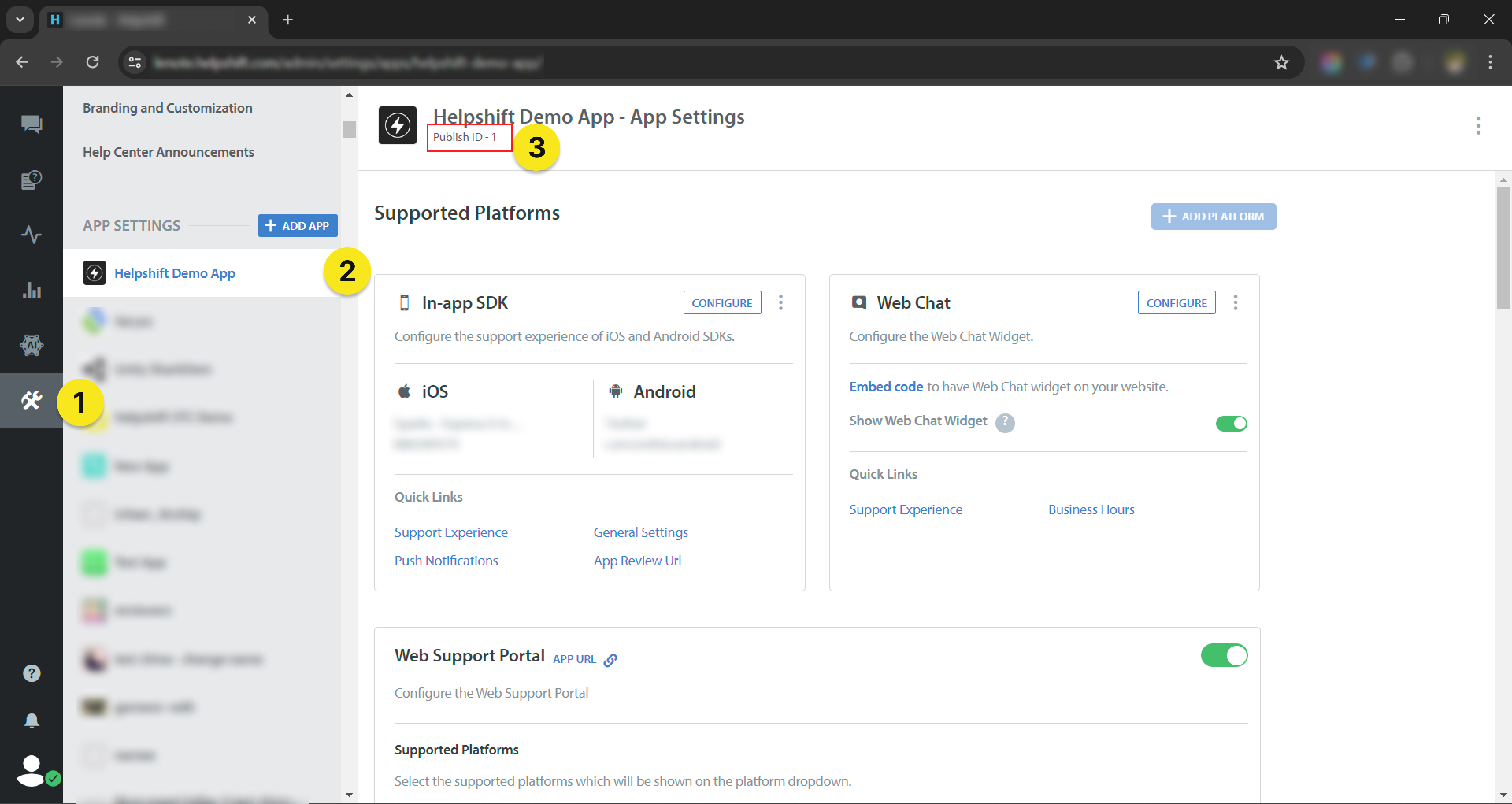 3. Replace YOUR_APP_ID with details found at Settings > Your App (eg. Helpshift Demo App) > Publish ID.