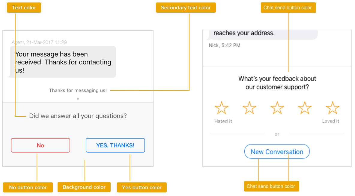 Secondary text colorApplies to text color of footers, attachment info, conversation ended message and ratings.