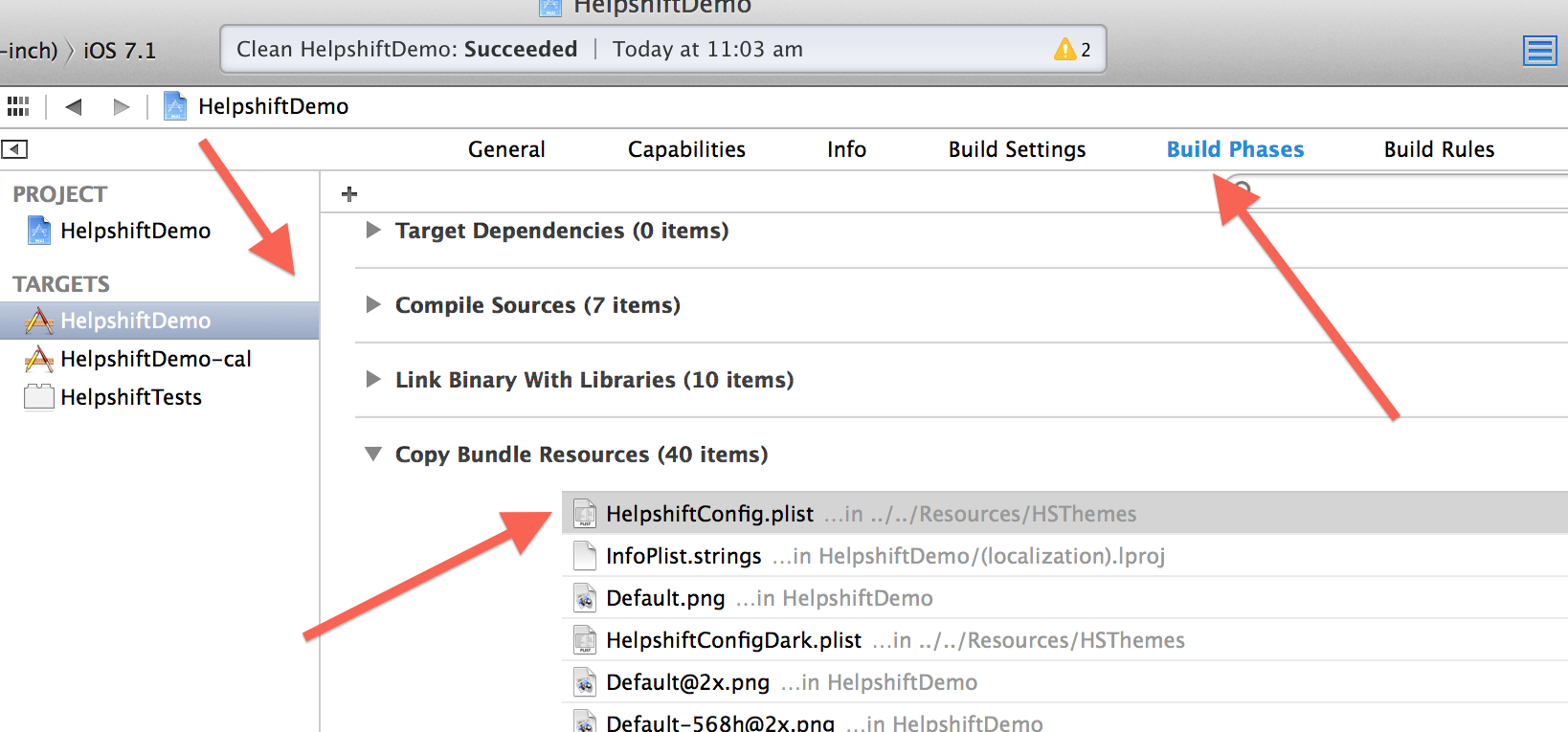 • Make sure that HelpshiftConfig.plist is correctly imported into your Xcode project. It should shown under Build Phases > Copy Bundle Resources for your target. To make sure that your project is picking up the plist correctly, you can run the following snippet in your project: