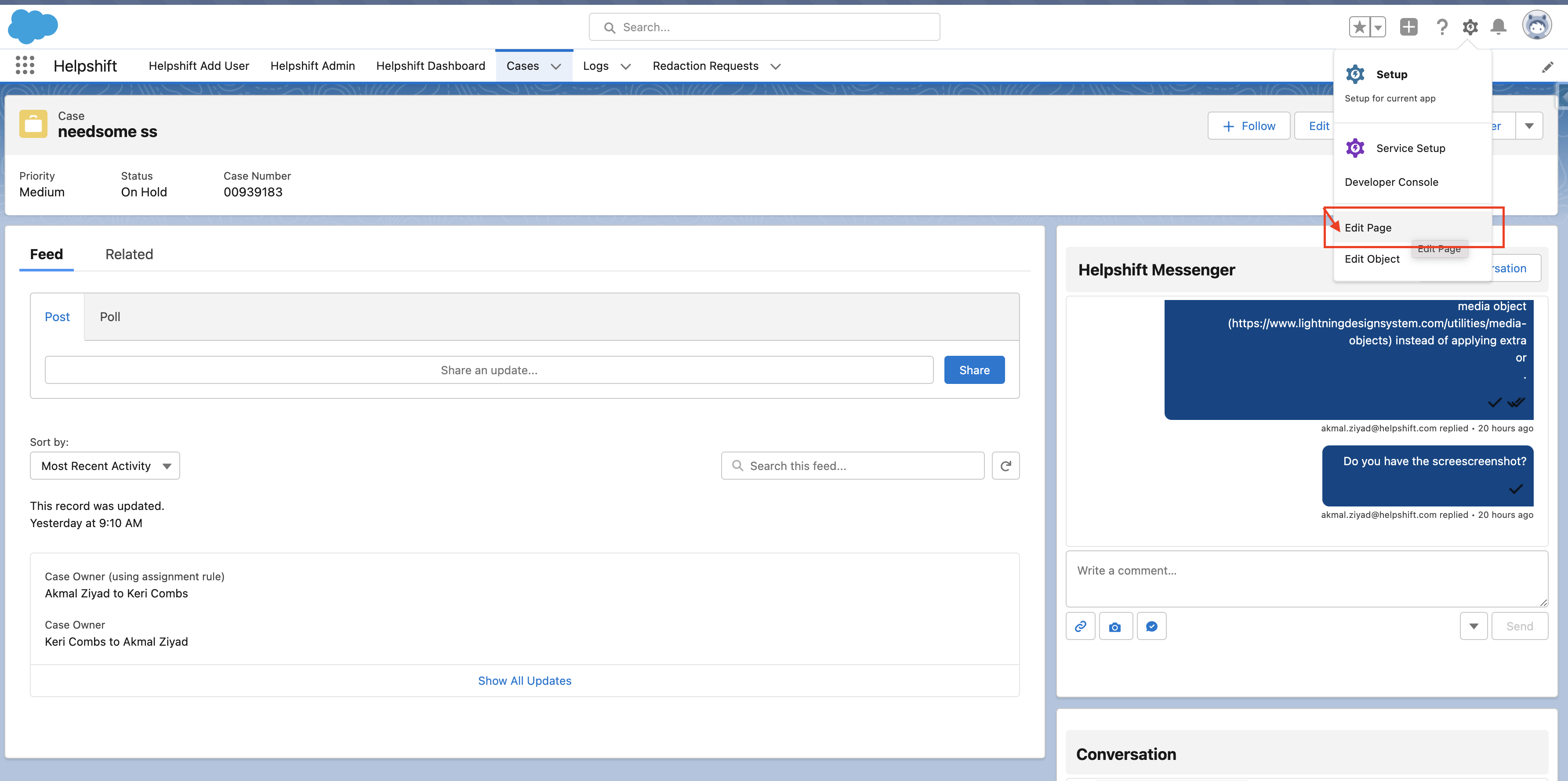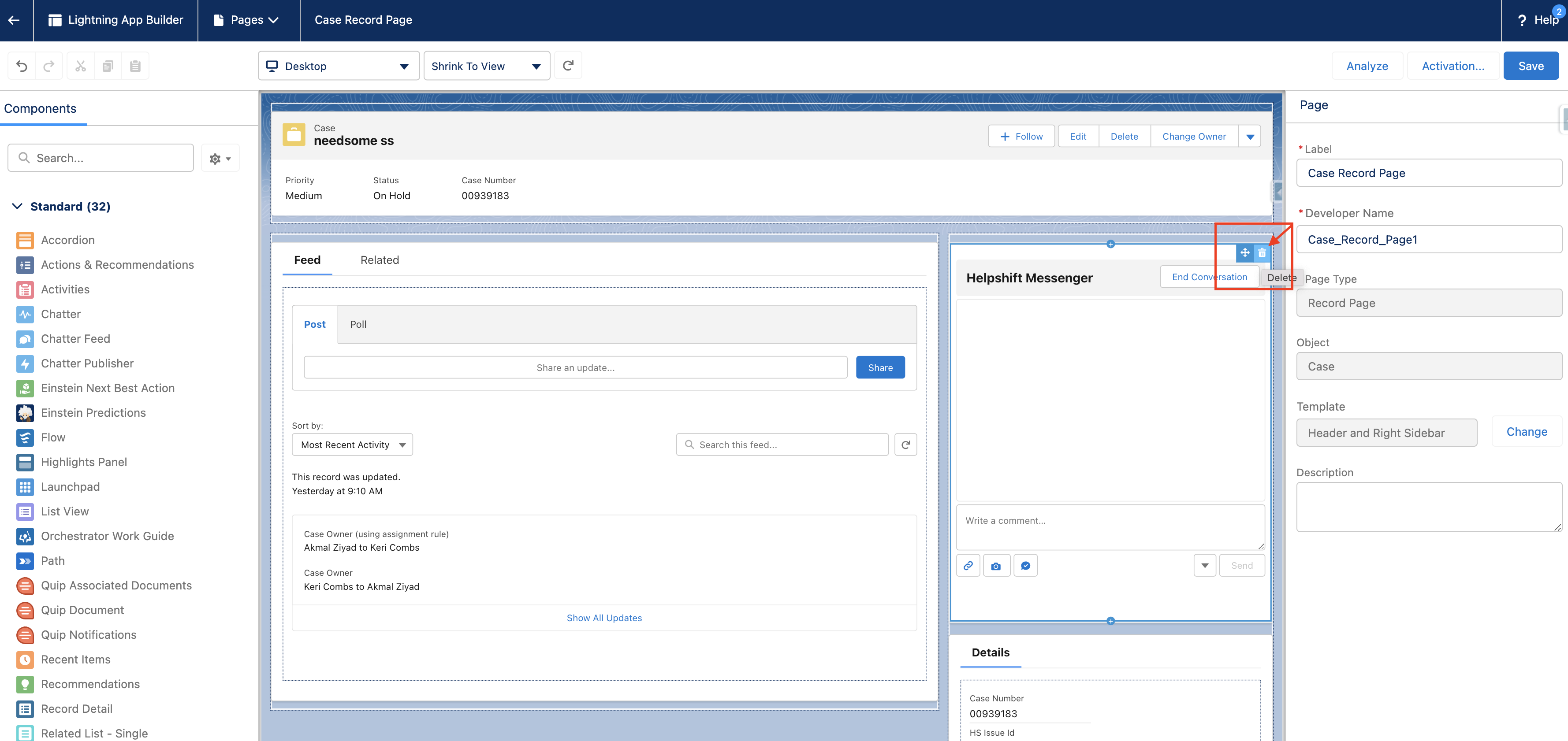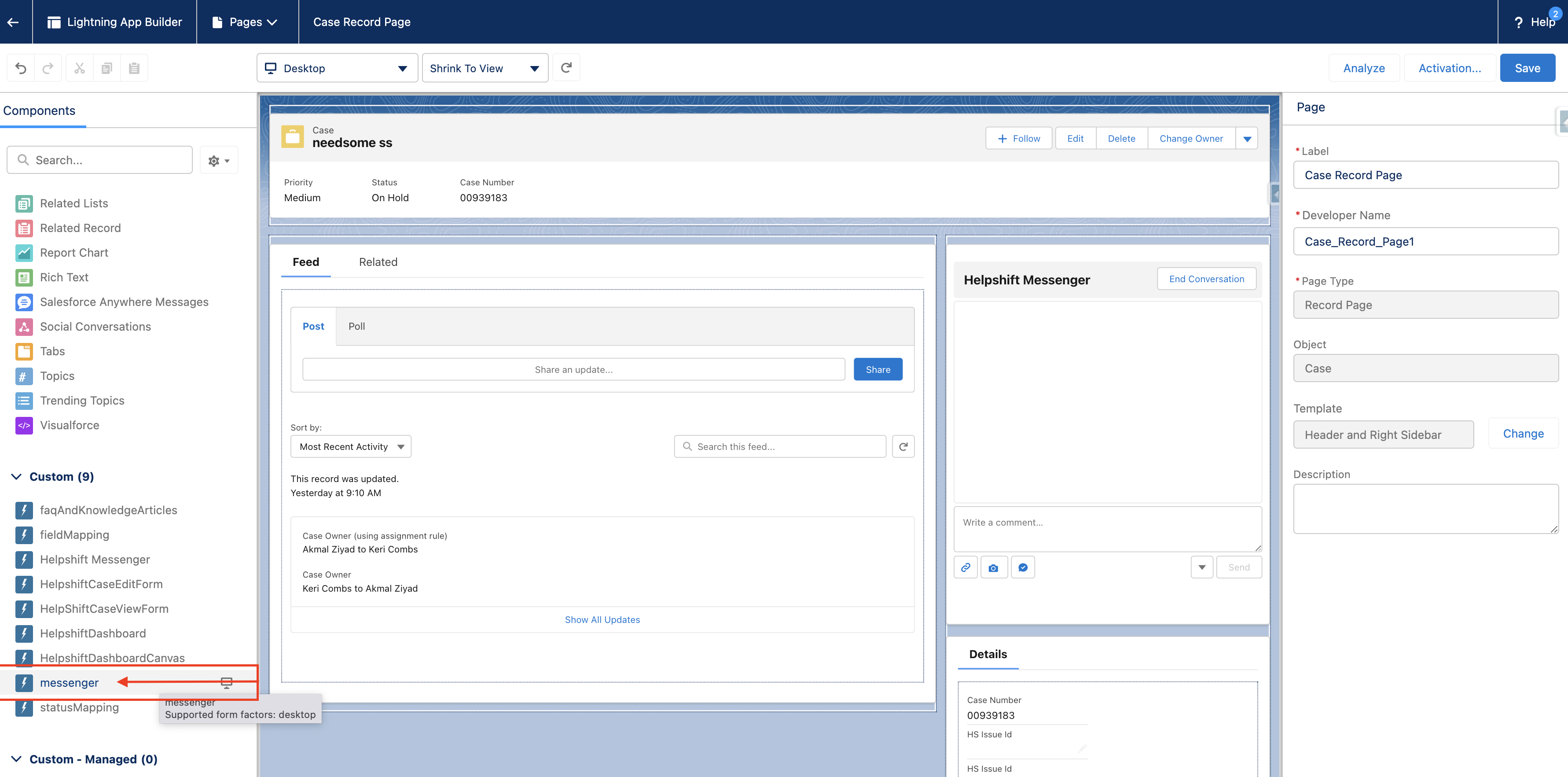 4. Manually add the new Helpshift Messenger to the case record page. (Steps for this are described in the next section.)