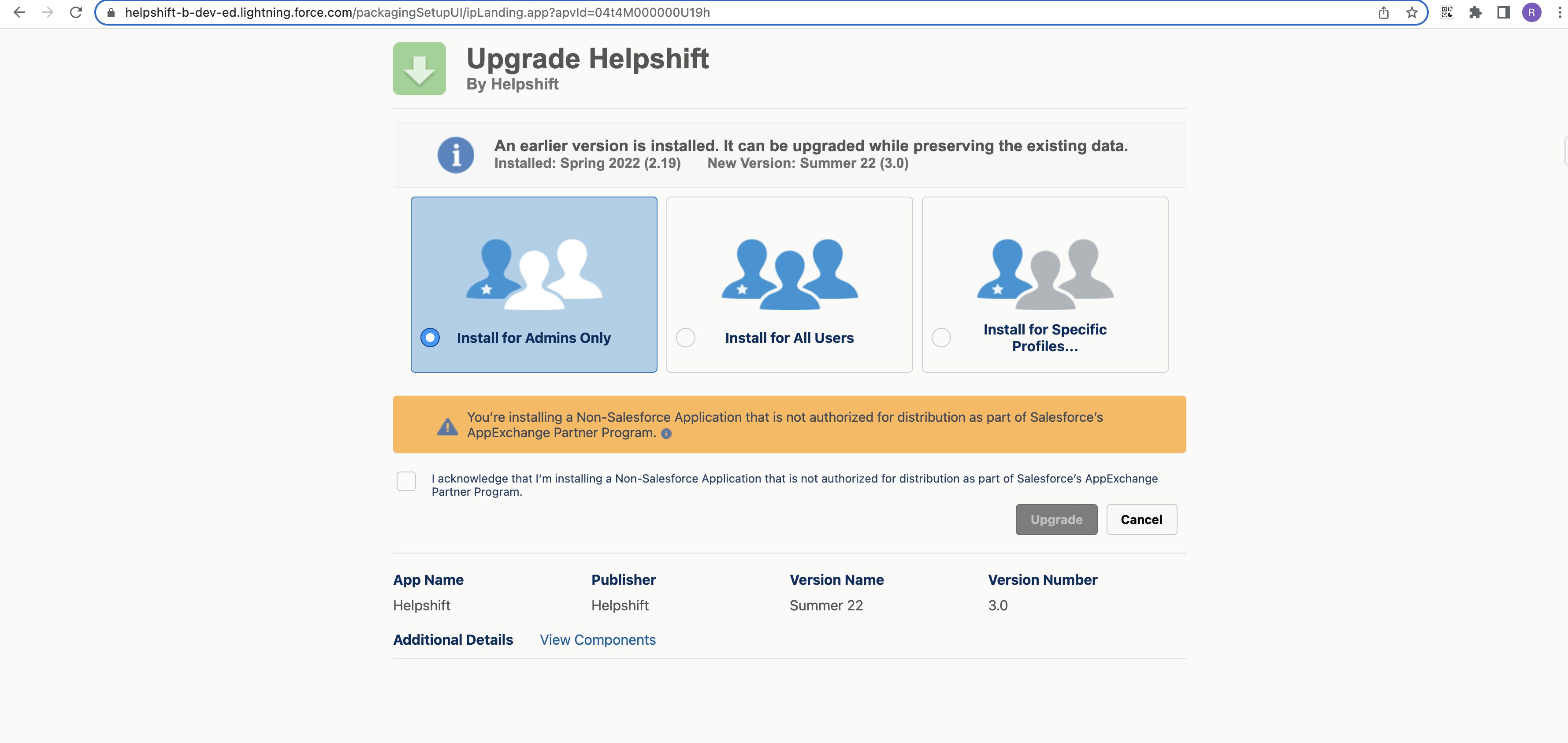 4. The upgrade page would show the current version and the new version. In the above image, the current version is 2.19.